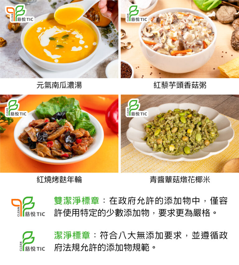 在雙潔淨標章驗證產品有「元氣南瓜濃湯」,以濃郁南瓜搭配香醇奶油與鮮奶油,呈現清甜醇厚的異國風味,是老少咸宜的濃湯選擇。另外三項獲得潔淨標章驗證的產品同樣精彩,「紅燒烤麩年輪」完美結合烤麩與年輪兩種Q彈口感,搭配筍片、香菇、木耳,醬香濃郁、冷熱皆宜。還有榮獲銀髮友善食品獎的「紅藜芋頭香菇粥」,以白米與紅藜麥為基底,加入芋頭與香菇熬煮,濃郁芋香與米粒融合,是一款讓人回味無窮的古早味暖胃好粥。
