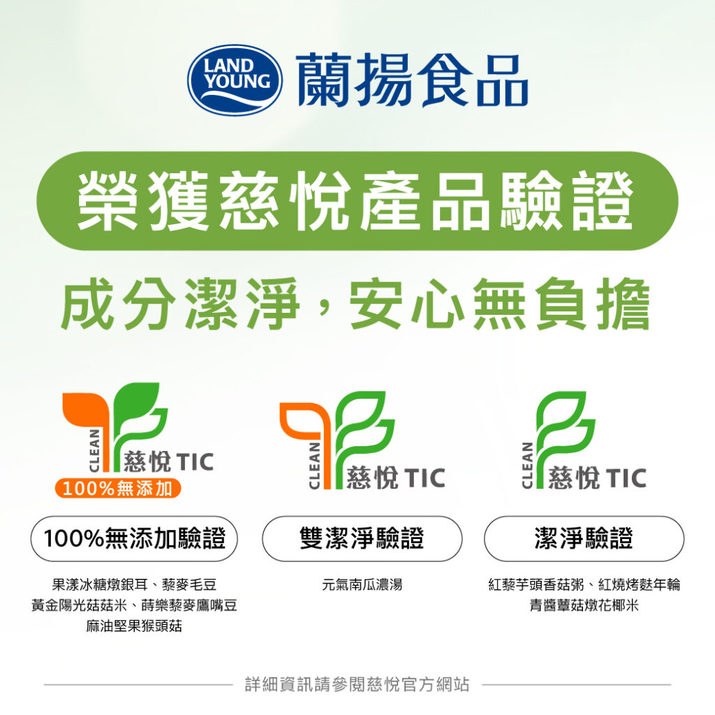 深耕台灣食品界41年、行銷海外30多個國家、有「冷凍調理食品龍頭」之稱的蘭揚食品,在食品安全與品質管理上再創佳績,旗下共有九項產品通過慈悅國際驗證,其中,包括「蒔樂藜麥鷹嘴豆」等五項產品更榮獲最嚴格的「100%無添加標章」,完全不使用所有食品添加物,實踐「真食物零添加」理念,展現企業對純淨食品的堅持與承諾。